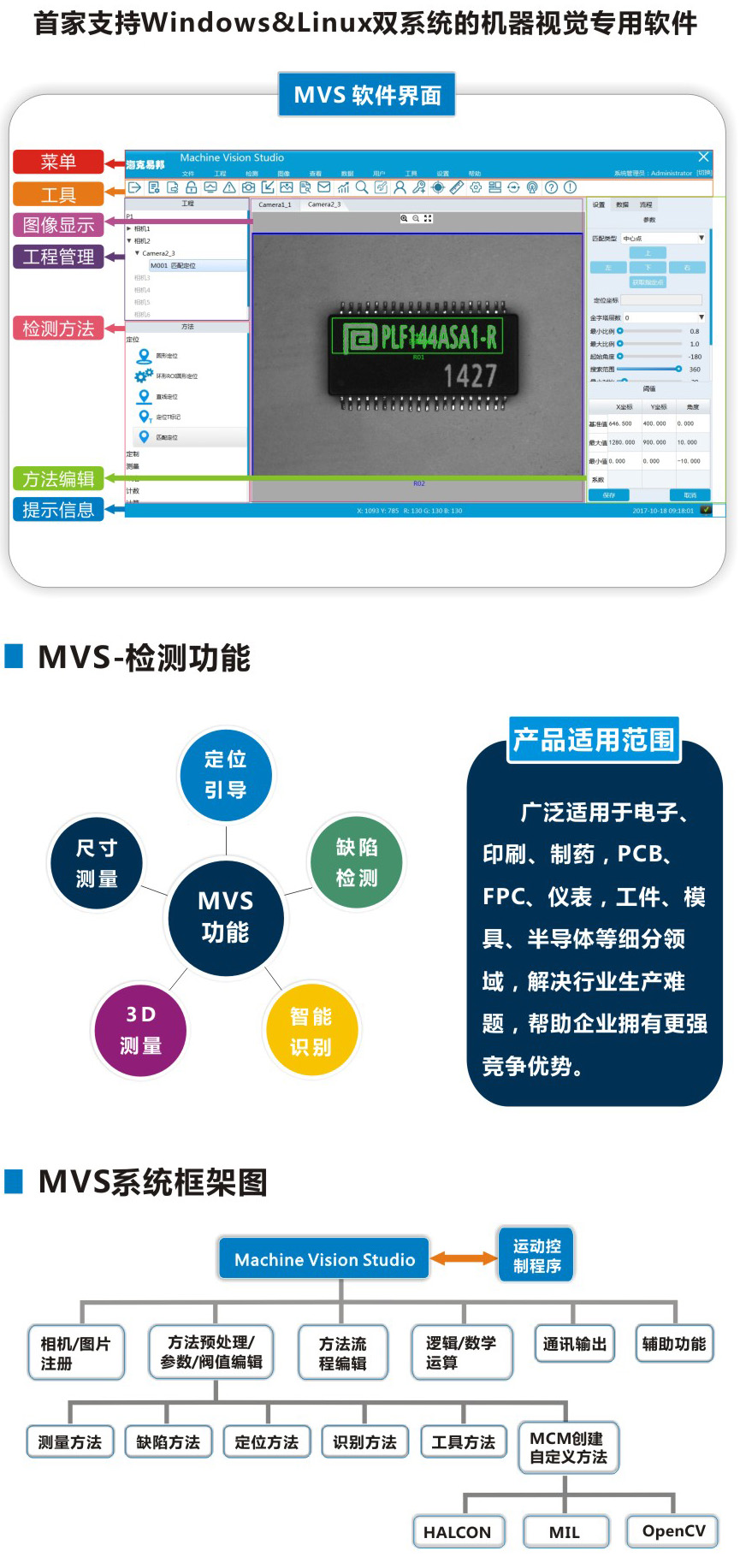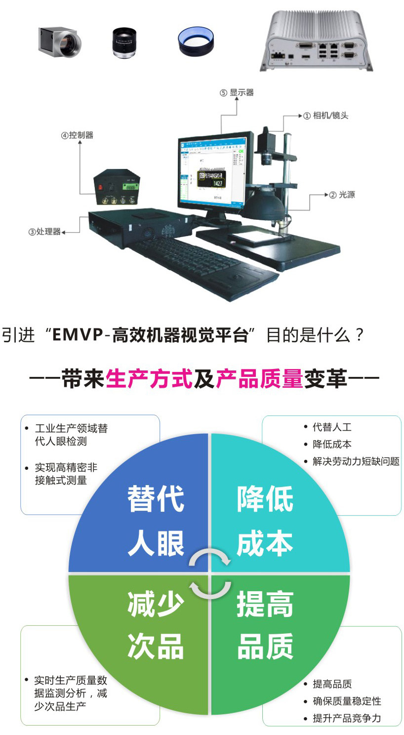 ▆ EMVP介紹 EMVP開放式機器視覺平臺是海克易邦獨立自主開發(fā)的機器視覺產品。該產品集軟件和硬件于一體,整合本公司在機器視覺行業(yè)十年技術積累,同時結合各類視覺檢測的實際需求而推出,為客戶提供最優(yōu)的機器視覺解決方案。產品軟件最新推出MVS版本,操作更加簡單,設置更加靈活,同時支持高級用戶二次開發(fā)。EMVP機器視覺平臺具有集成度高、功能豐富、穩(wěn)定可靠等特點,適用于缺陷檢測、尺寸測量、定位引導、字符識別、平整度檢測等機器視覺應用領域。